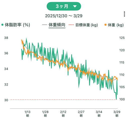 • 100日目:108.4 kg(ズボン 3L)