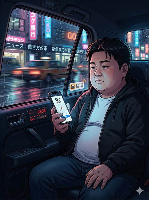 帰りは贅沢に「GO」アプリでタクシーを召喚。 わずか5分で到着する利便性。車内で、私はある社会問題についてドライバーと語り合いました。