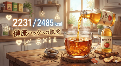 お洒落なカフェの味ではありません。しかし、内臓が「整っていく」感覚。純リンゴ酢特有のキレが、ルイボスティーの風味とぶつかり合いながらも、身体の代謝を強制起動させるような。健康とは、時にこうした「少しの違和感」を楽しむことなのかもしれません。