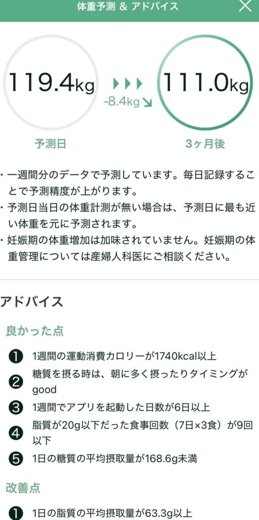 「AI分析:3か月後の予測体重は111.0kgです」