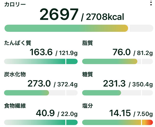 禁断の「ねこまんま」。 これにより、余計な脂質を足すことなく、満足感だけで完食することに成功しました。 結果、本日の収支は 2697 / 2708 kcal。 残り 11kcal。まさに、針の穴を通すような精密な着地です。