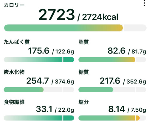 本日の総摂取カロリー:2723 kcal 目標カロリー:2724 kcal
