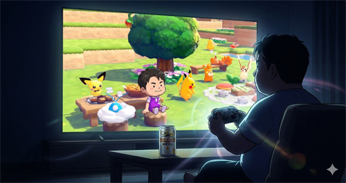 寝ている時間を除けば、ほぼすべての時間をリビングのTVモニターの前で過ごしている計算になります。かつて120kgあったエネルギーが、今すべてSwitch 2を通じて大画面へと集約されている。