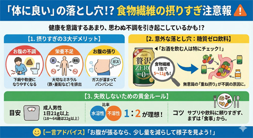 2. アルコールとのダブルパンチ: アルコール自体も腸を刺激するため、水溶性食物繊維による「お腹のゆるさ」が加速し、翌朝の下痢の原因になることも。